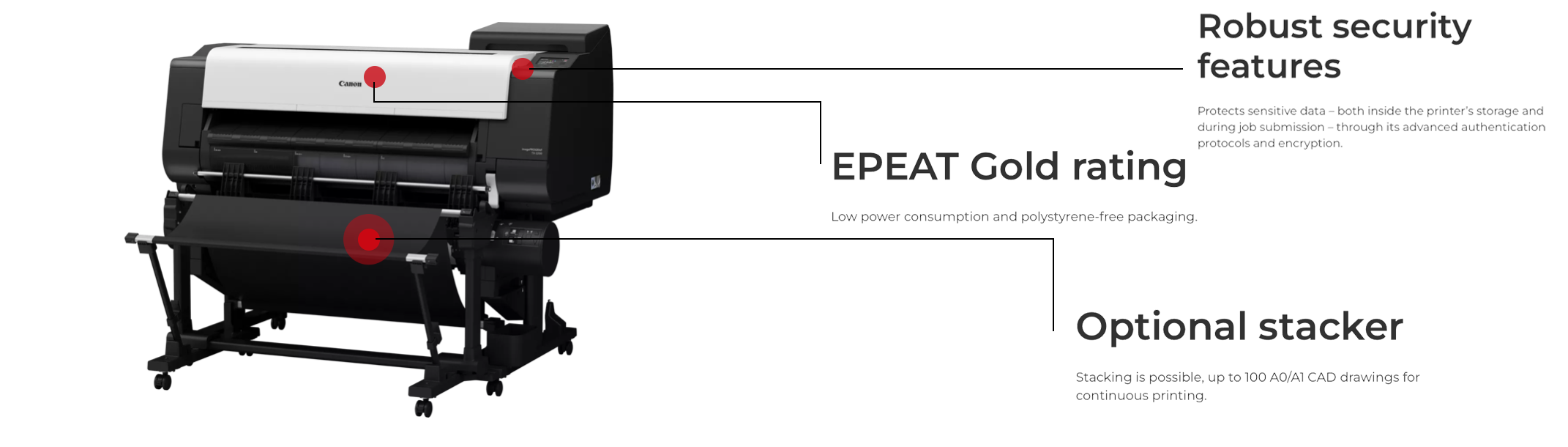 The imagePROGRAF TX-4200 is an eco-friendly printer, earning an EPEAT Gold rating for energy efficiency and featuring packaging that is completely free of expanded polystyrene (EPS).